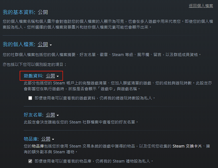 3、確保您的個人檔案,以及子選單遊戲資料皆為 「公開」,請「不要勾選」將遊玩時數設為私人選項。